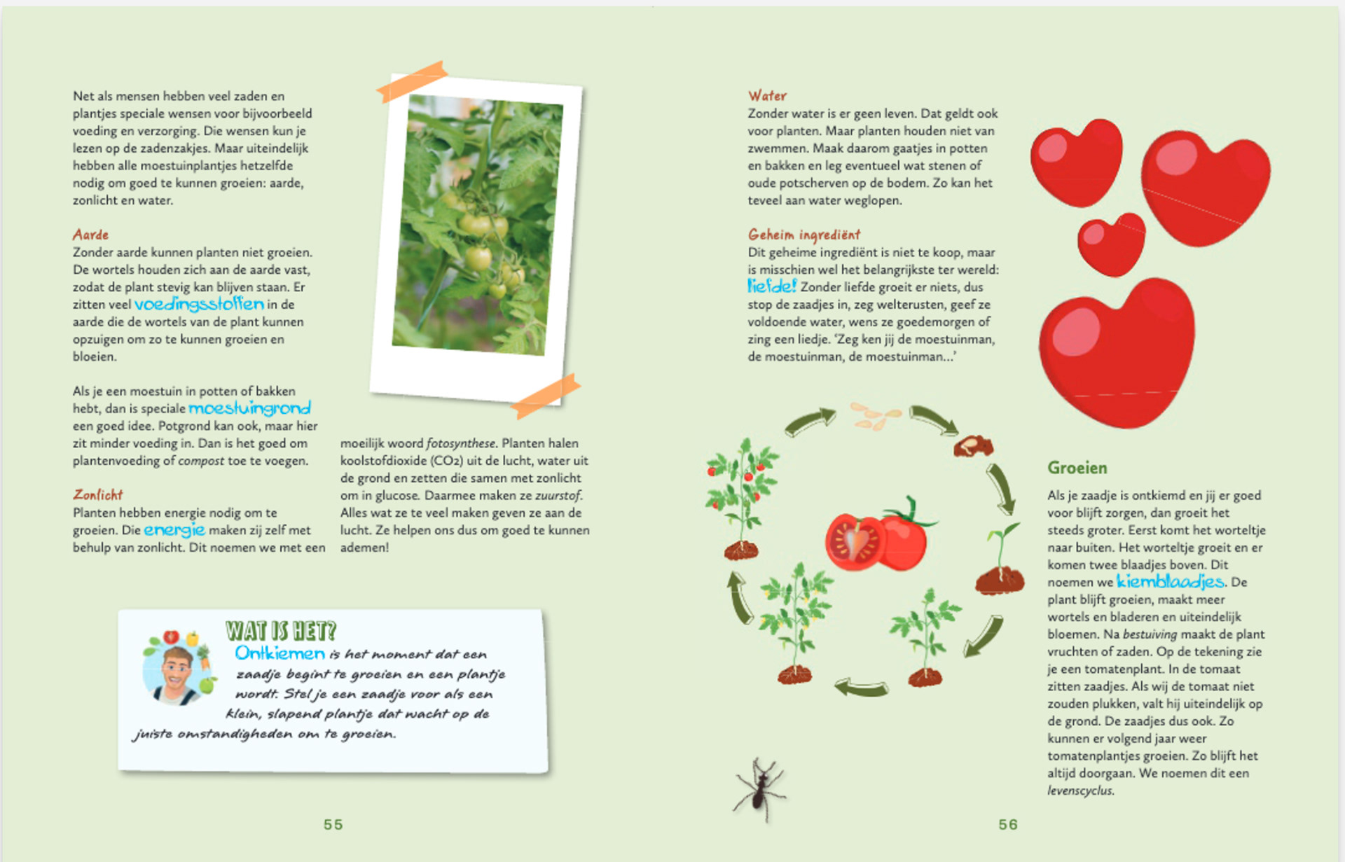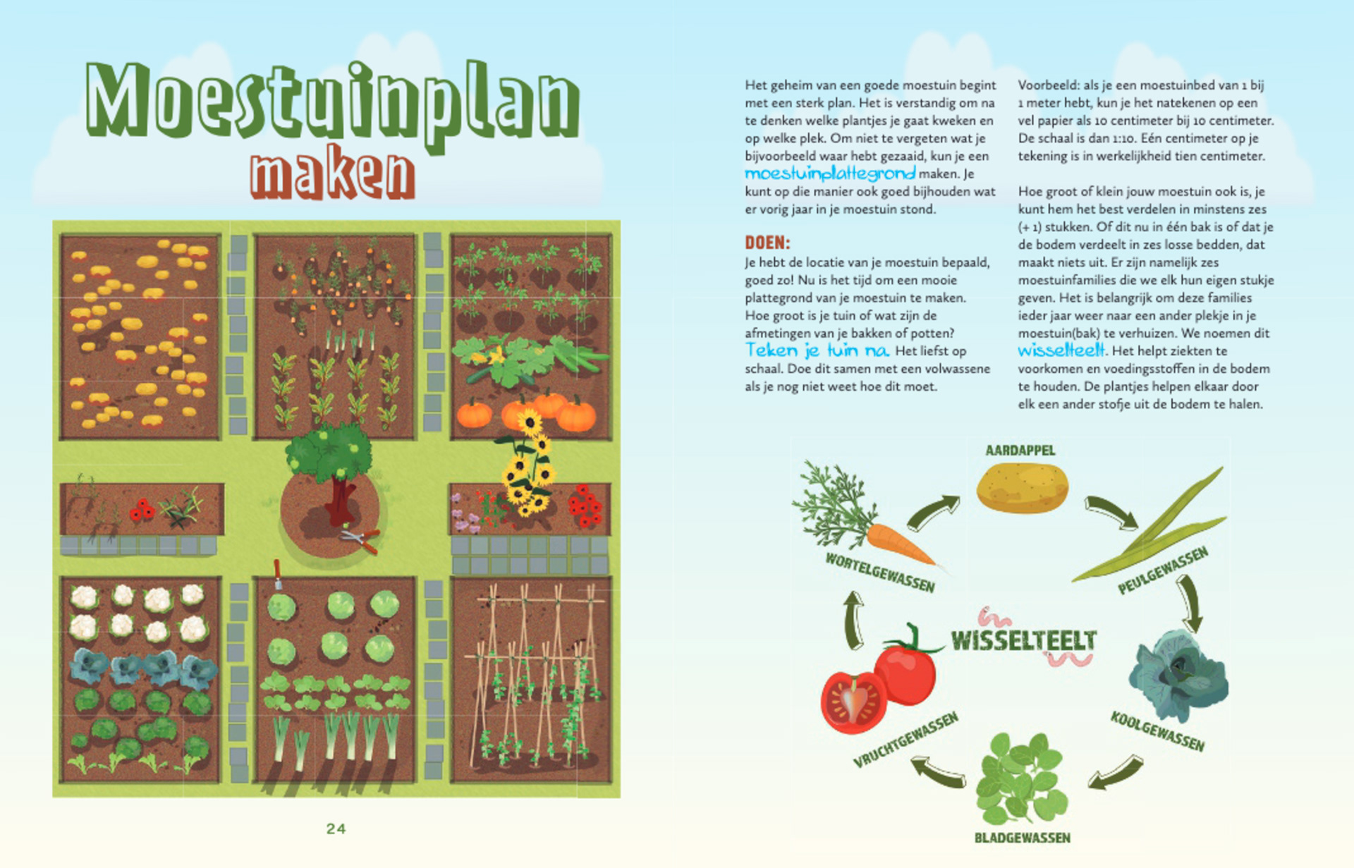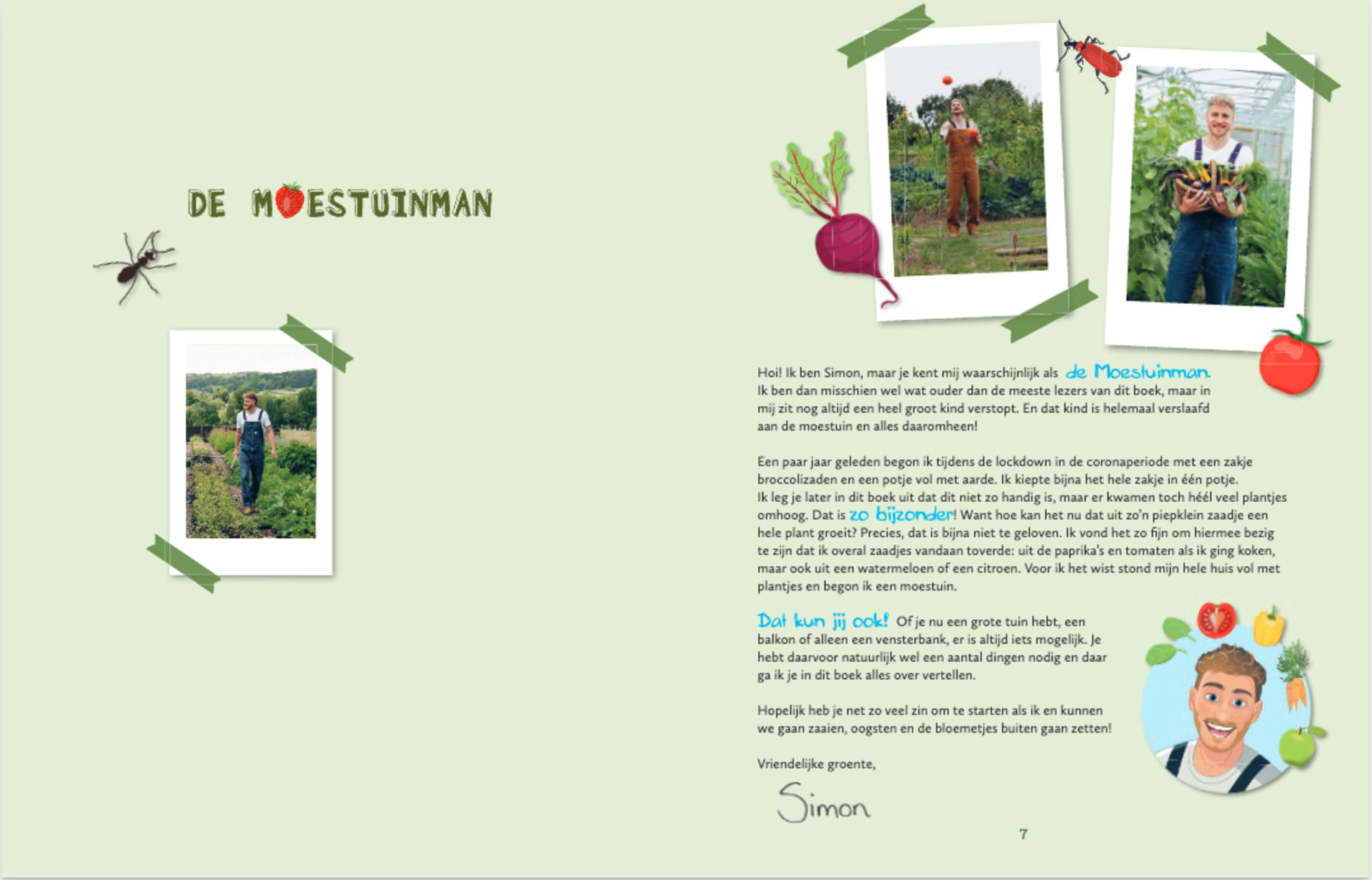 Cover design and full colour book illustrations for "De Moestuinman"; Anyone can grow a vegetable garden- author: Simon Eurlings - photos: Beryl van der Mossel - illustrations and cover design: Bianca van Loon
