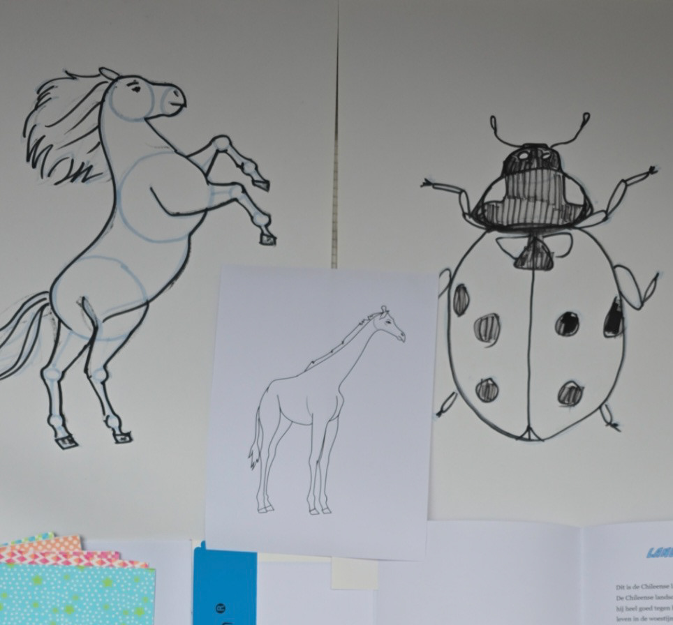 Tijdens mijn live tekenfeest leren kinderen stap voor stap hoe ze zelf dieren kunnen tekenen. Op groot formaat doe ik alle stappen voor, terwijl de kinderen mij nadoen in hun eigen schetsboekje, dat ze na afloop mee naar huis mogen nemen om verder te oefenen.