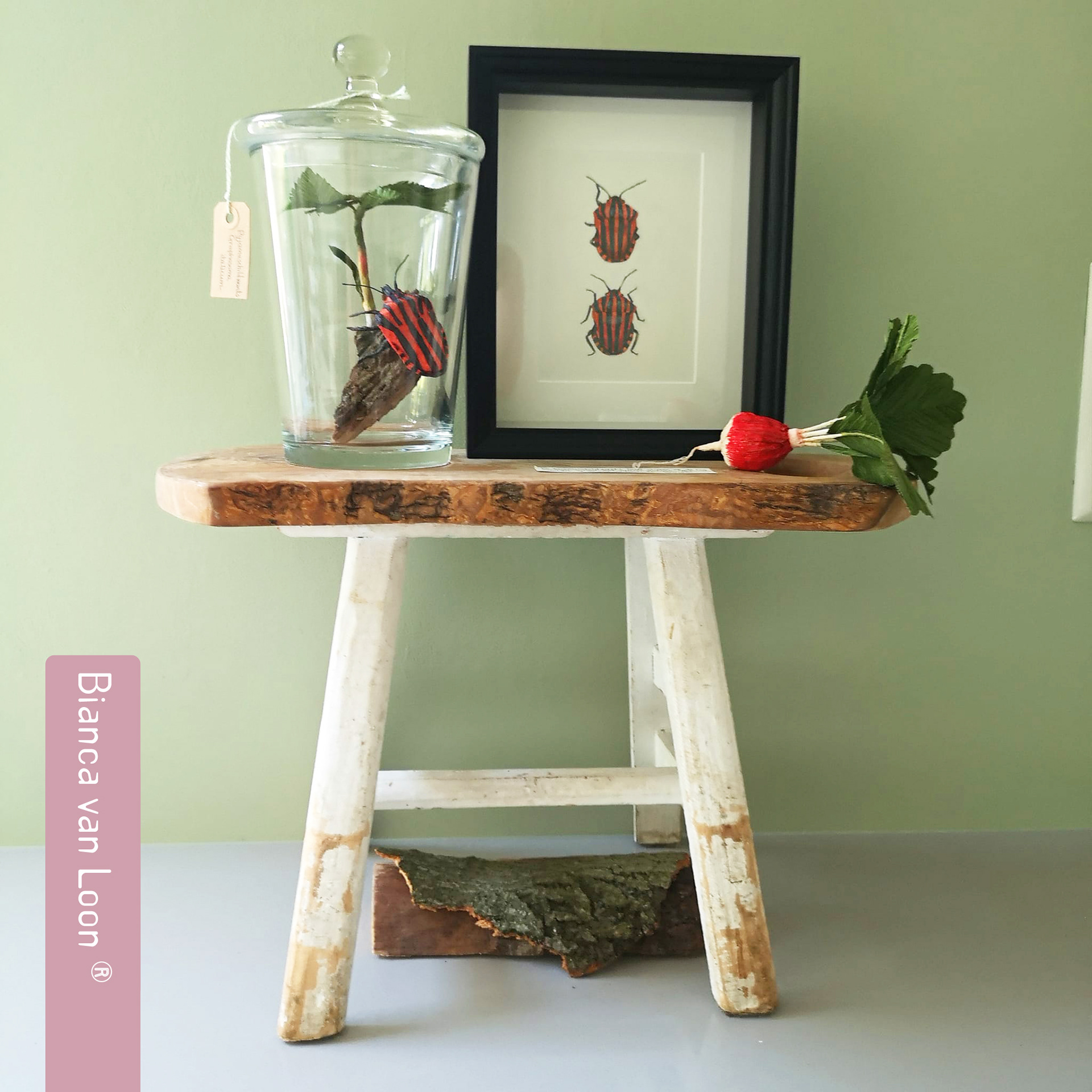Glass jar (L) with paper insect
